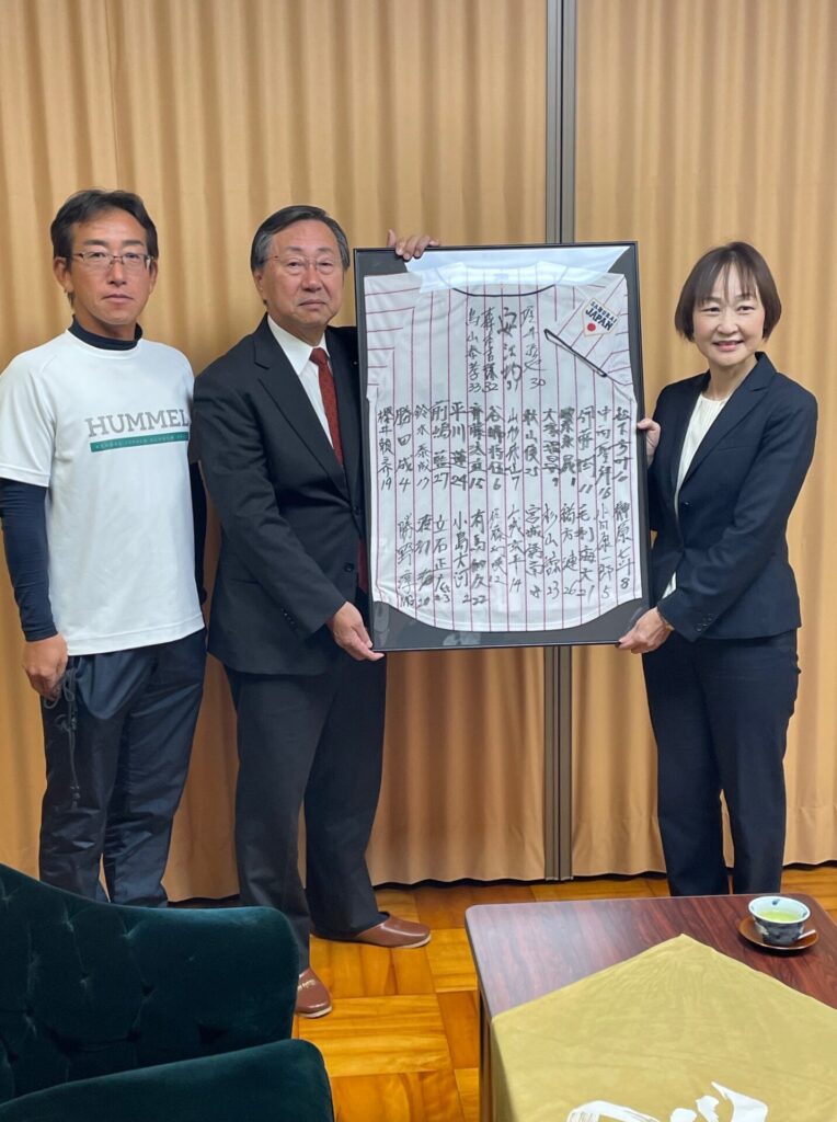 大学日本代表選手サイン入りユニフォームを韮山高校へ贈呈